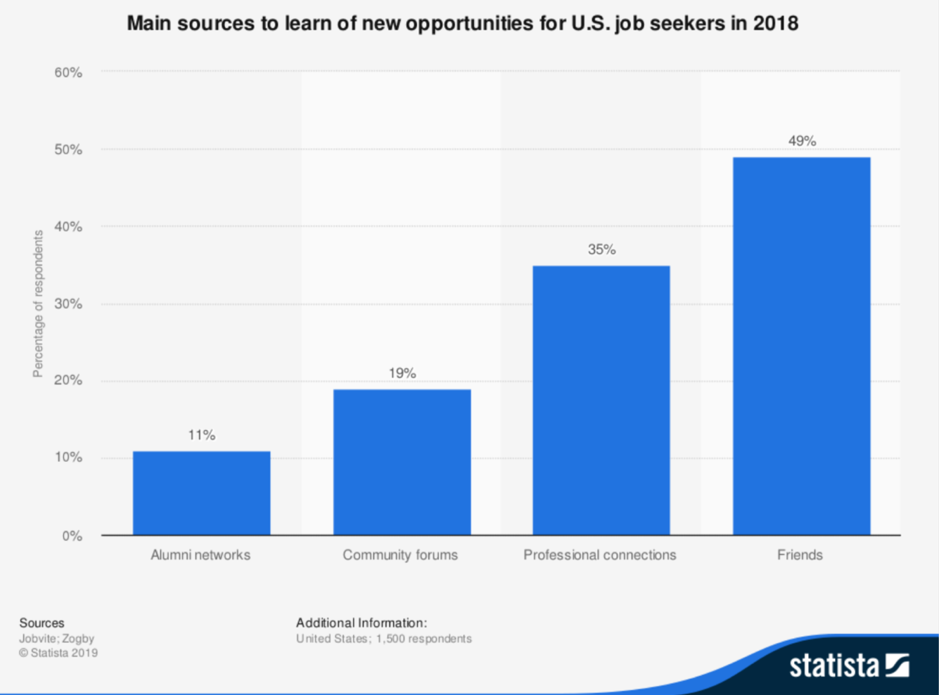 This chart from Statista shows that friends and professional connections provided the most new opportunities for job seekers in 2018.