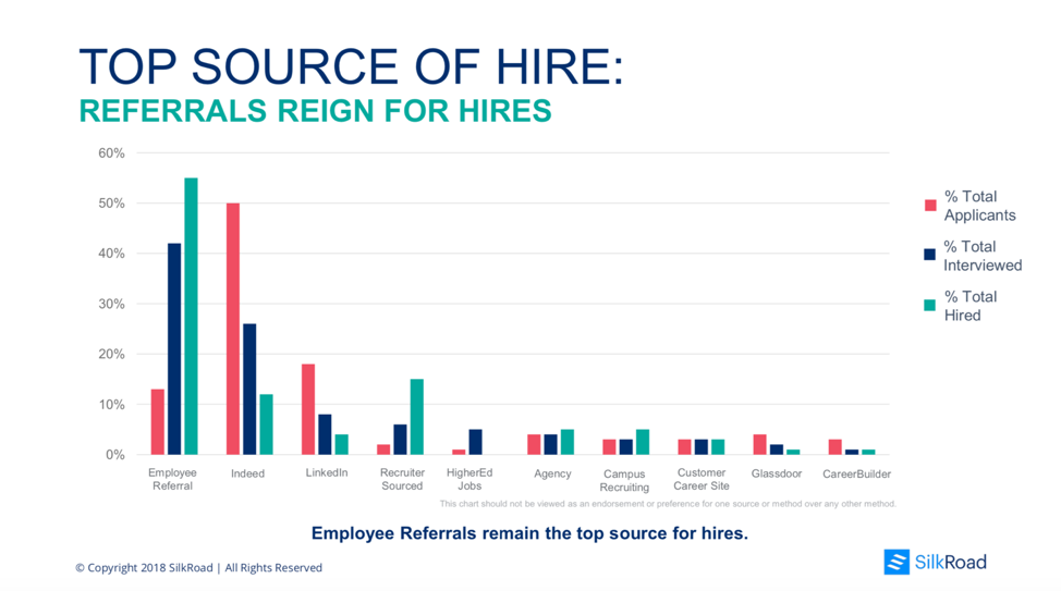 There’s evidence that networking plays a major role in hiring. The chart below from SilkRoad’s 2018 research report on hiring sources shows that referrals were the largest source of job hires by a long shot.