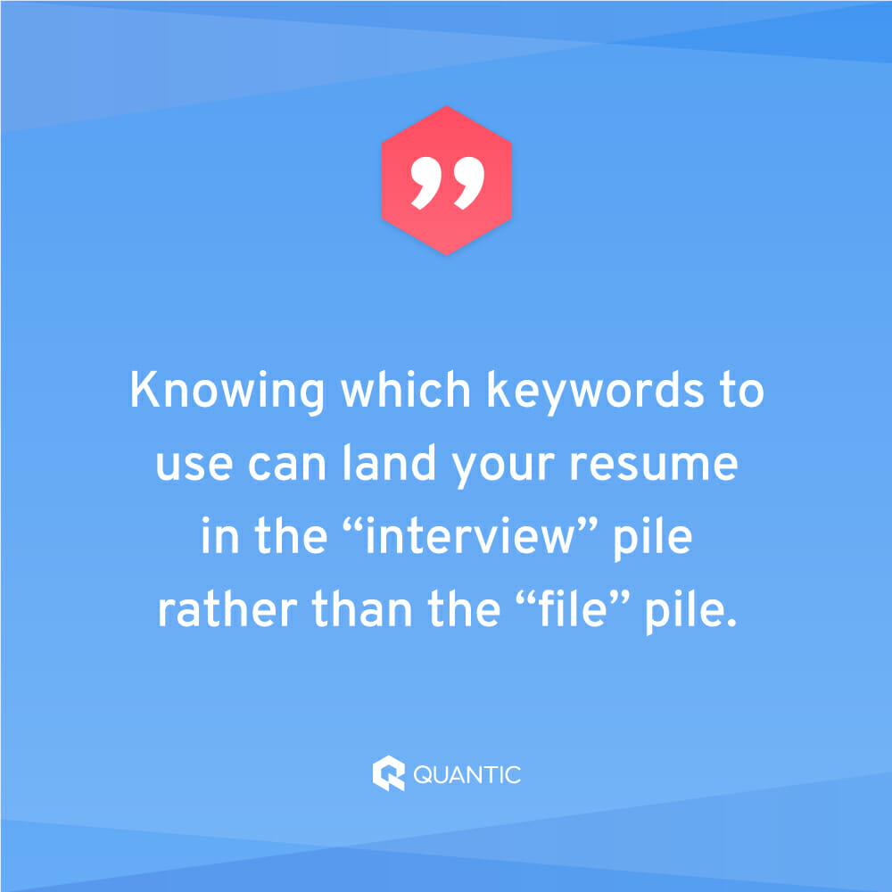 Unfortunately, HR recruiters can only budget a minute or two (or less) to each candidate’s resume. Consequently, you must use keywords in your resume, so it makes it into the “interview” pile rather than the “file” pile.