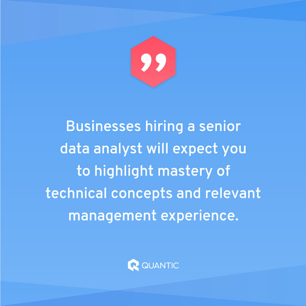 A resume for a senior data analyst position will be more likely to earn an interview if it highlights the mastery of technical concepts and relevant management experience. Unless the employer is looking for a lateral hire, the recruiter will probably not expect you to list senior-level management experience. However, the employer will likely expect you to include some prior experience leading a team or managing a project when applying for a senior position.