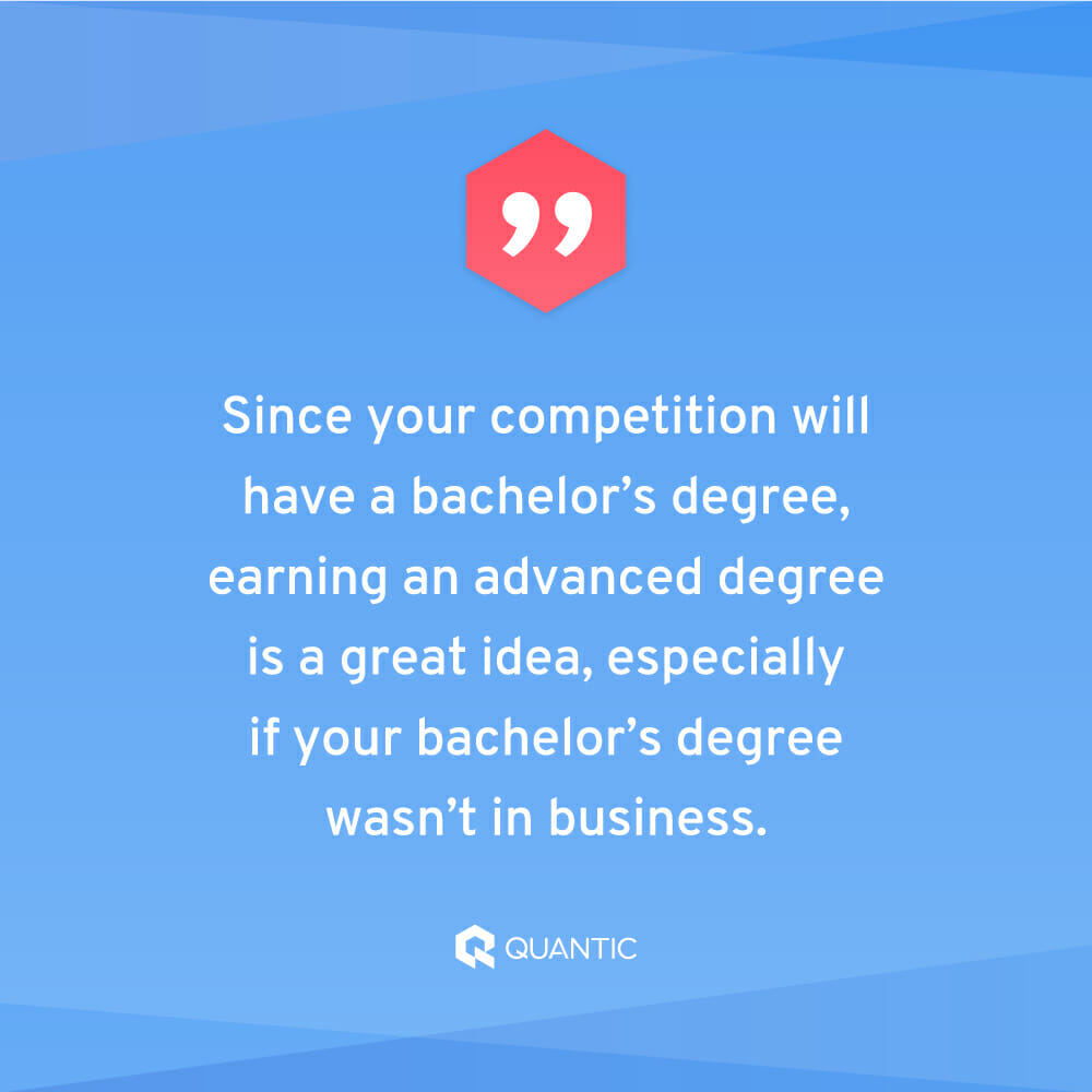 Since your competition will have a bachelor’s degree, it might have occurred to you to seek out an advanced degree to set yourself apart. That would be a great idea, especially if your bachelor’s degree wasn’t in business.