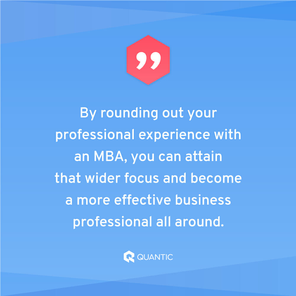 - Online MBA. Online MBAs are ideal for people who want the flexibility to take courses while they work, or who don’t want to relocate to attend a specific school. Many don’t offer career networks, which can hinder your ability to connect with other business professionals. Others, like Quantic’s program, do. That’s something to consider when investigating this route. (Here are some more thoughts on traditional versus online MBAs.)